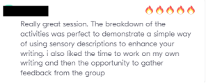 “Embarked on a creative journey together and got our creative writing juices flowing. Already signed up for another.”